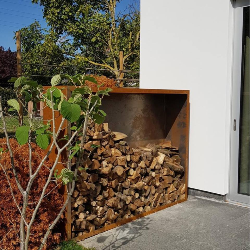 Ontdek de cortenstalen houtopslag EGURA met rug van GEROBA, een slim doordacht designelement voor een sfeervolle toevoeging aan jouw tuin. Deze cortenstalen houtopslag biedt niet alleen praktische opslagruimte voor al het hout van je buitenhaard maar fungeert ook als een esthetisch verantwoord element in jouw buitenruimte. Het warme en natuurlijke karakter van het cortenstaal harmonieert perfect met het gestapelde hout, waardoor een evenwichtig en tijdloos geheel ontstaat.