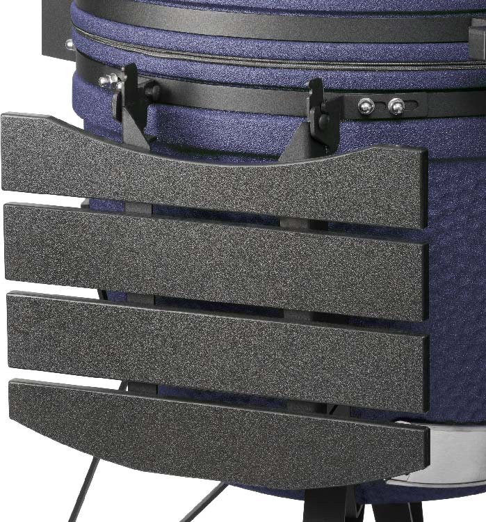 Voor een luxere uitstraling zijn er walnoothouten zijtafels beschikbaar, die je eenvoudig één-op-één kunt verwisselen met de standaard HDPE zijtafels. Ze veranderen niets aan de functionaliteit of het formaat, maar geven je kamado een warme, exclusieve uitstraling. Het bijbehorende walnoothouten handvat maakt het geheel stijlvol en compleet.