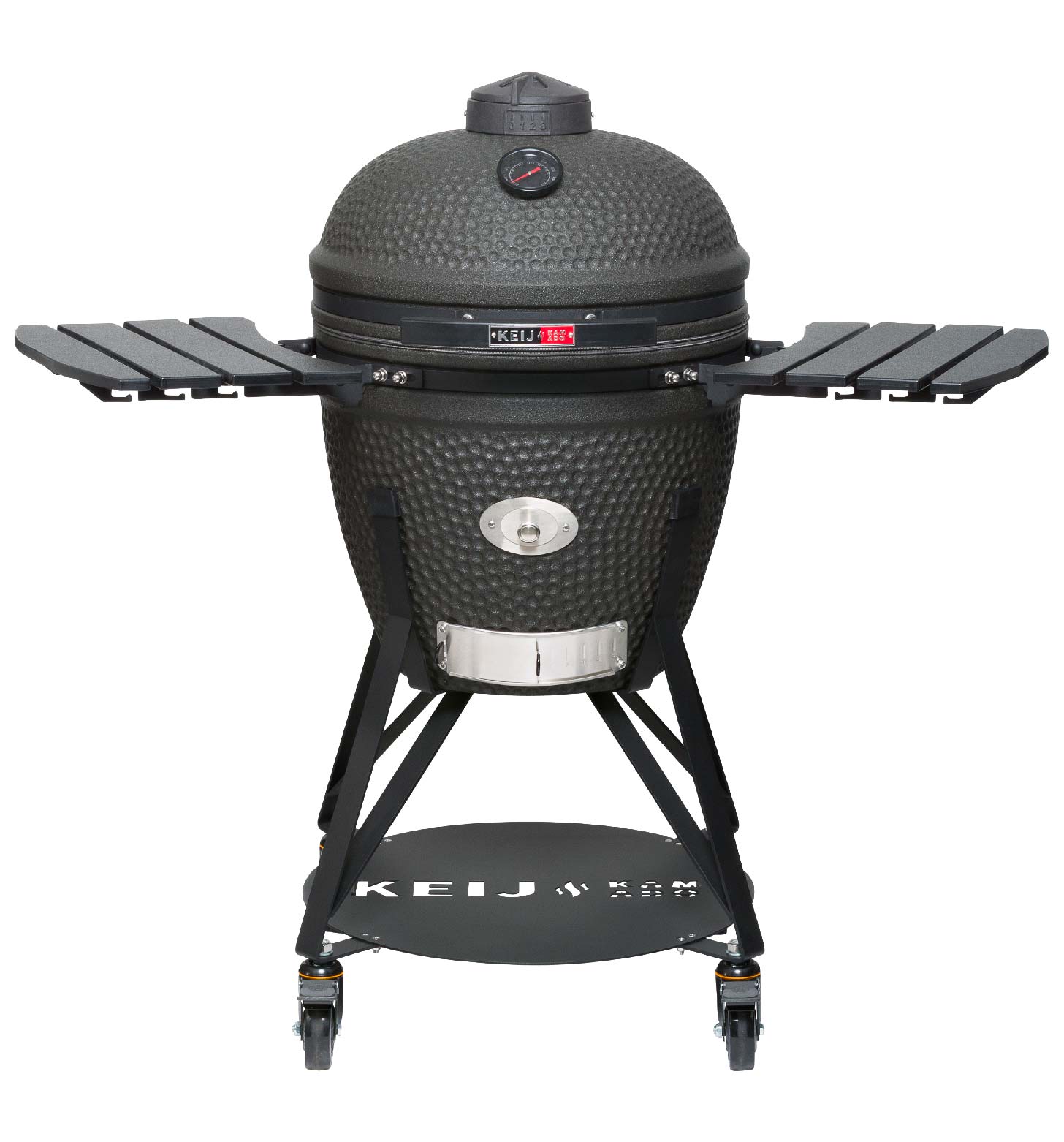 Met een gewicht van 91,5 kg staat deze KEIJ Kamado Large Legend Mat Zwart 21 inch stevig, maar dankzij het robuuste onderstel met grote wielen rol je hem zonder moeite naar de perfecte plek. En die matte zwarte look? Die geeft je buitenkeuken een stoere, elegante vibe die iedereen zal opvallen.