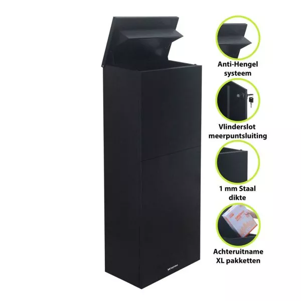 • Veilige werking – Pakket valt na inworp in een afgesloten compartiment en blijft veilig opgeborgen.